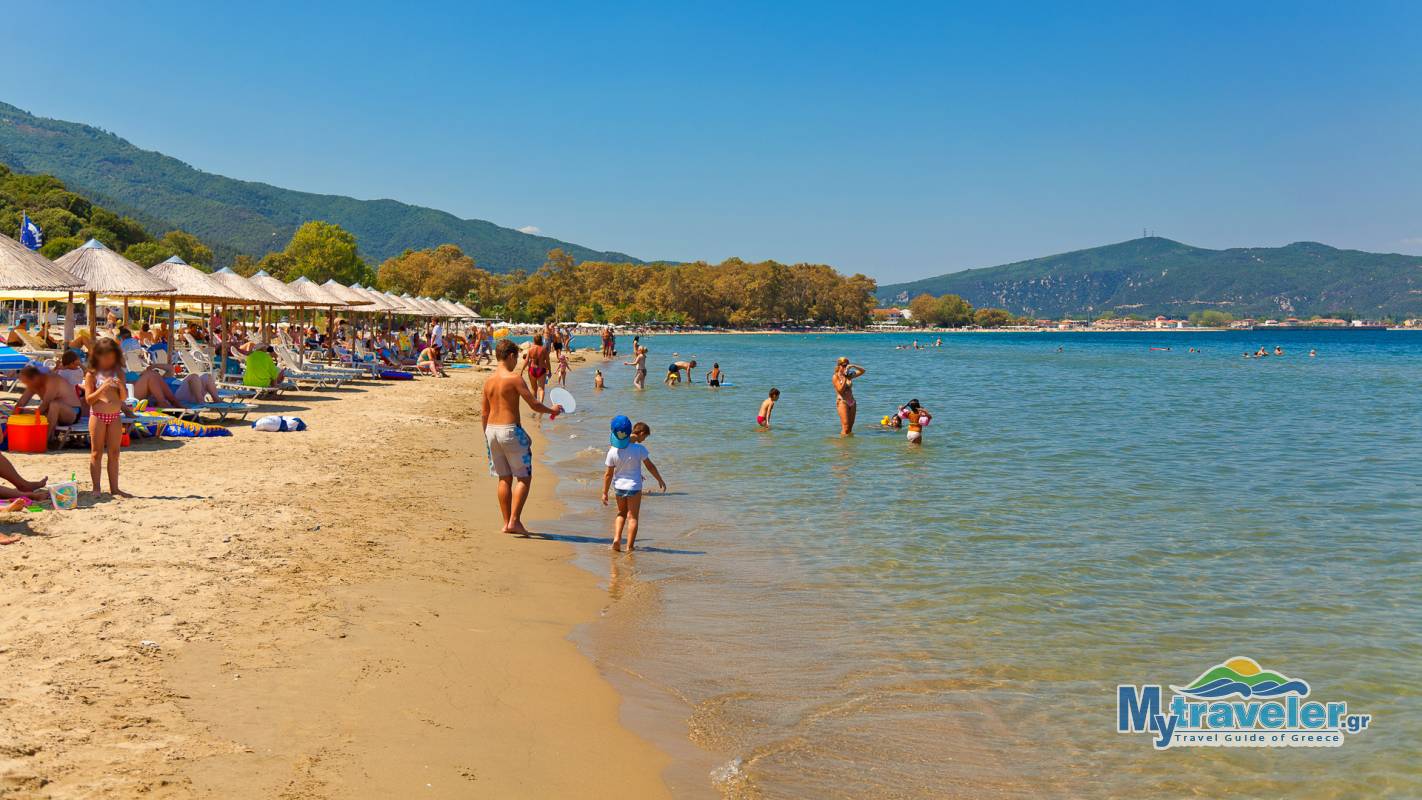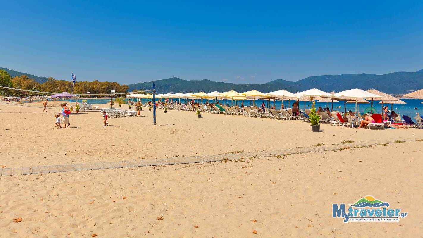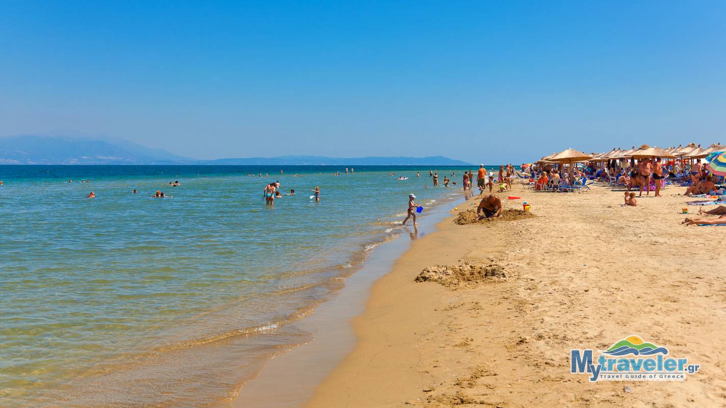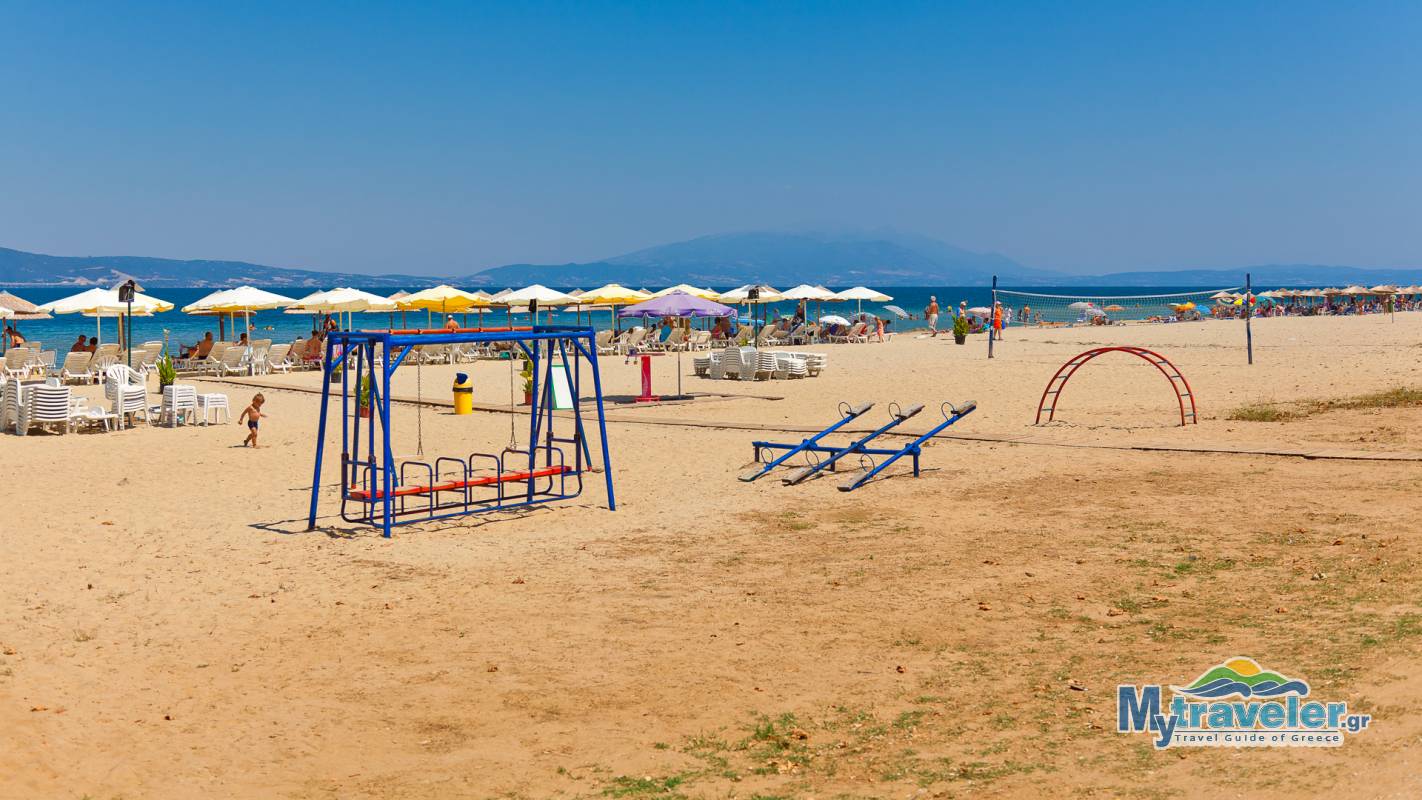 Nalazi se na izlasku iz Stavrosa, u pravcu ka Olimpijadi i Uranopolisu, u naselju Milies, udaljena oko 1km od centra Stavrosa. Plaža je duga oko 2km i uglavnom široka, ali postoje i delovi na kojima je izuzetno uska. Peščana je, a u nekim, uglavnom rubnim i užim delovima, mogu se naći kamenje i stene koje joj daju divlju notu. Plitko more pogodno je za decu, a izuzetno čista i bistra voda nagrađena je Plavom zastavicom. Organizovana je, na pojedinim delovima nalaze se ležaljke i suncobrani, a ima i slobodnih delova, tu je i teren za odbojku na pesku i dečiji parkić. Oni koji vole da se osame na plaži, mogu da nađu ovde svoj kutak i uživaju u tišini u pogledu na more i bujno zelenilo i planinu u zaleđu. Plaža je lako dostupna.